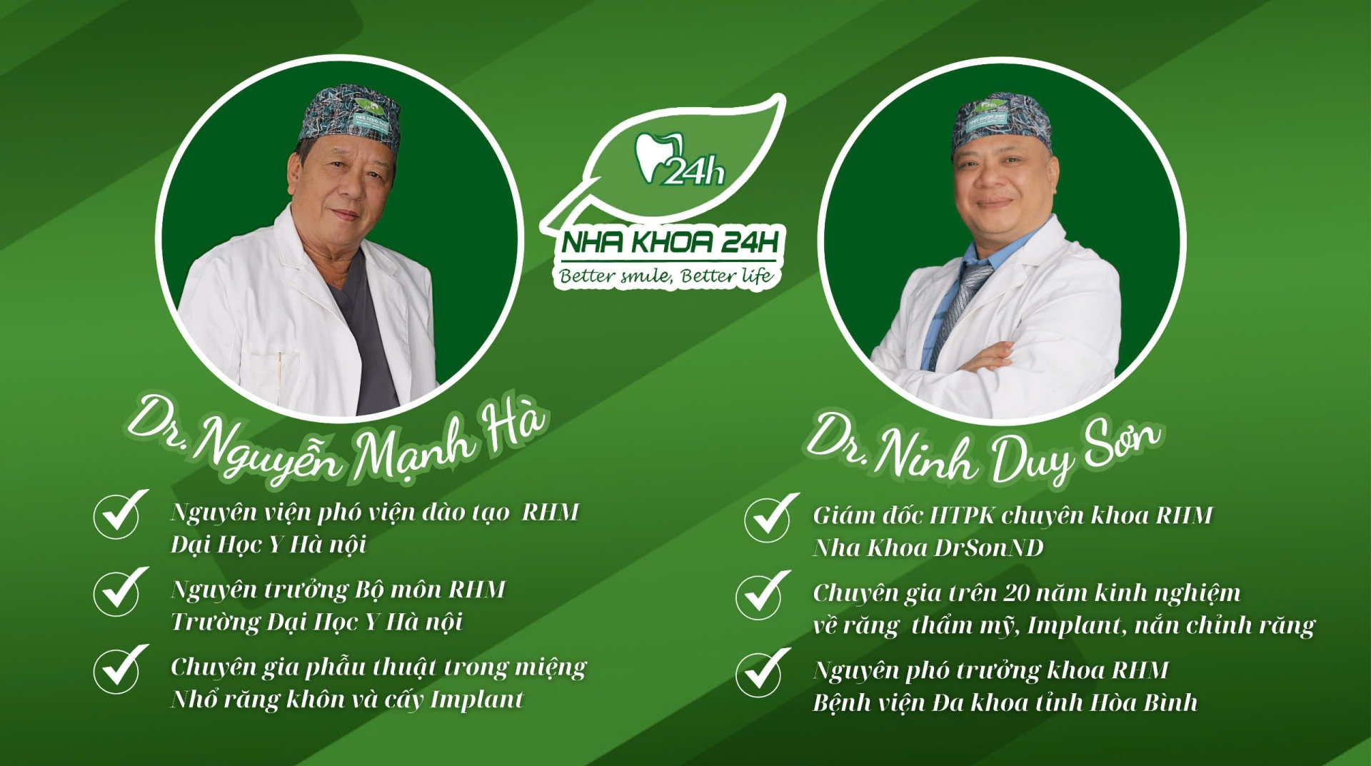 Đến với Nha khoa 24H, bạn sẽ được tư vấn và điều trị bởi đội ngũ Y Bác sĩ giỏi, được đào tạo bài bản tại các trường Đại học Y Dược nổi tiếng, từng tham gia và hoàn thành xuất sắc các khóa huấn luyện, đào tạo chuyên môn trong và ngoài nước. Trong đó có thể kể Bs Ninh Duy Sơn – Giám đốc Trung tâm Nha khoa 24H – Nguyên Phó Khoa RHM bệnh viện đa khoa tỉnh Hoà Bình với hơn 25 năm kinh nghiệm. Tiến sĩ, bác sĩ Nguyễn Mạnh Hà - Nguyên trưởng Bộ Môn Răng Hàm Mặt Trường Đại Học Y Dược Hà Nội, Mệnh Danh Bàn tay Vàng trong làng phẫu thuật trong miệng với hơn 45 năm tuổi nghề.